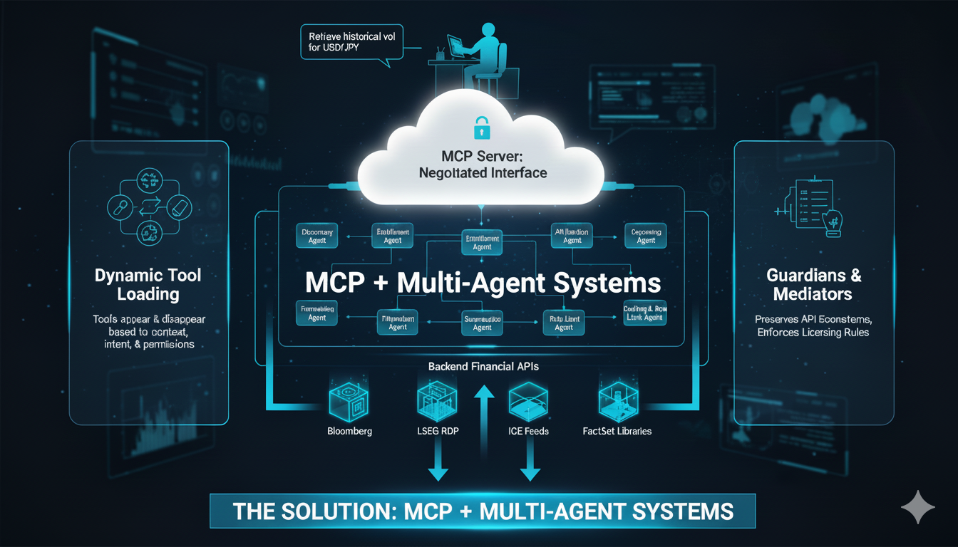 它不是让 MCP 去承受复杂性,而是让智能体系统彼此协作,在幕后代理复杂的金融 API、许可逻辑与数据治理。