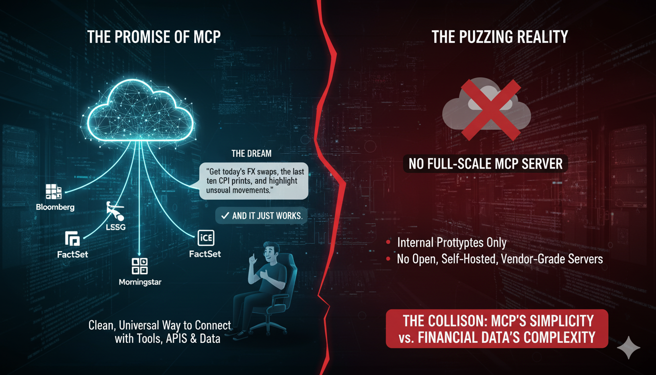 对于金融行业------一个完全依赖实时数据、分析与规范化流程的领域------MCP 看起来几乎是完美的接口。开发者很快开始想象:只要问一句,自然语言驱动的智能体就能自动从 Bloomberg、LSEG、ICE、FactSet、Morningstar 等数据巨头获取真实数据并完成分析。