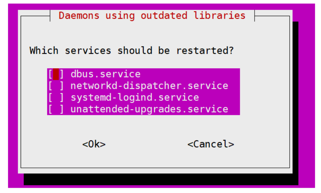 Ubuntu 22.04 版本之后,安装包的过程中,可能会出发 needstart 命令,与用户交互。如果不需要重启,按 Esc 即可~