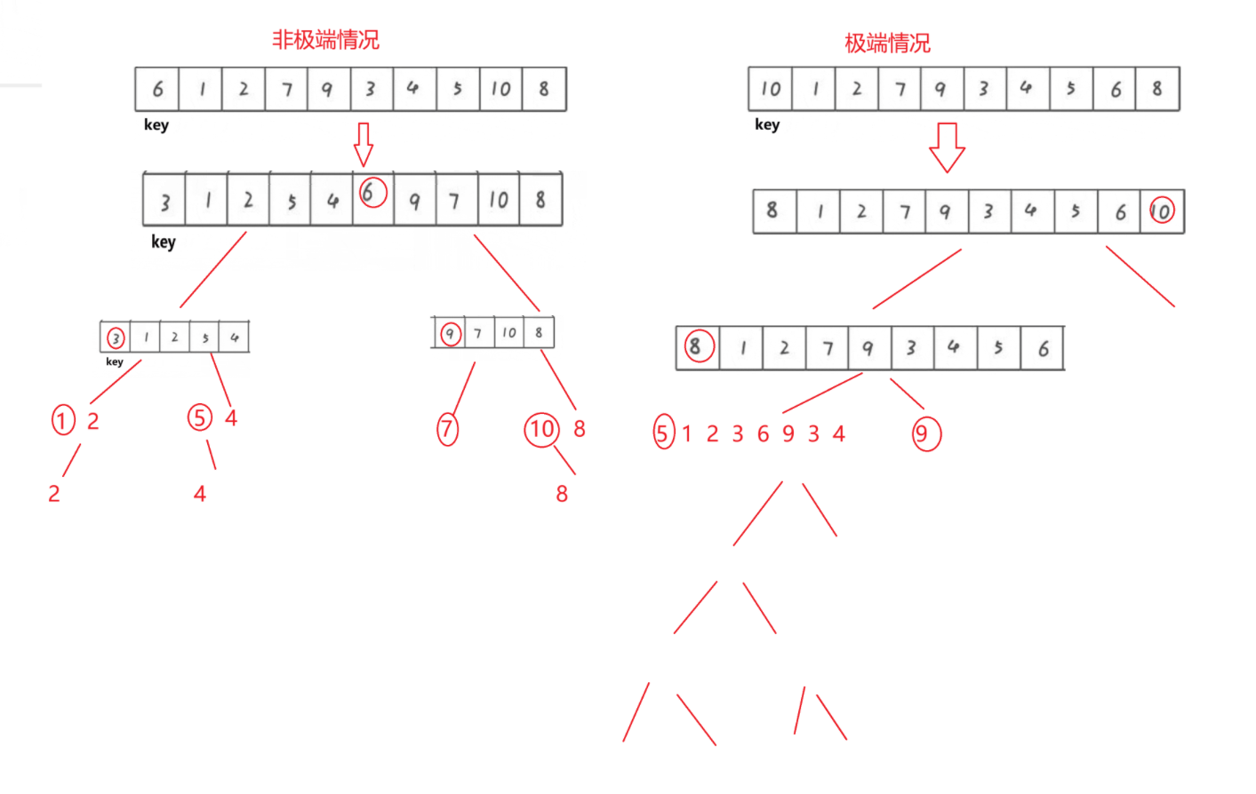 所谓三数取中是从数组的左中右三个位置选取一个中间值作为keyi,降低我们刚刚那种只选择最右边的数作为keyi会遇到极端情况的概率。我们简单画个图就可以看出来这个排序的过程的整理有些像二叉树,极端情况的深度比非极端情况的要深很多,因此我们最好还是要尽力避免。