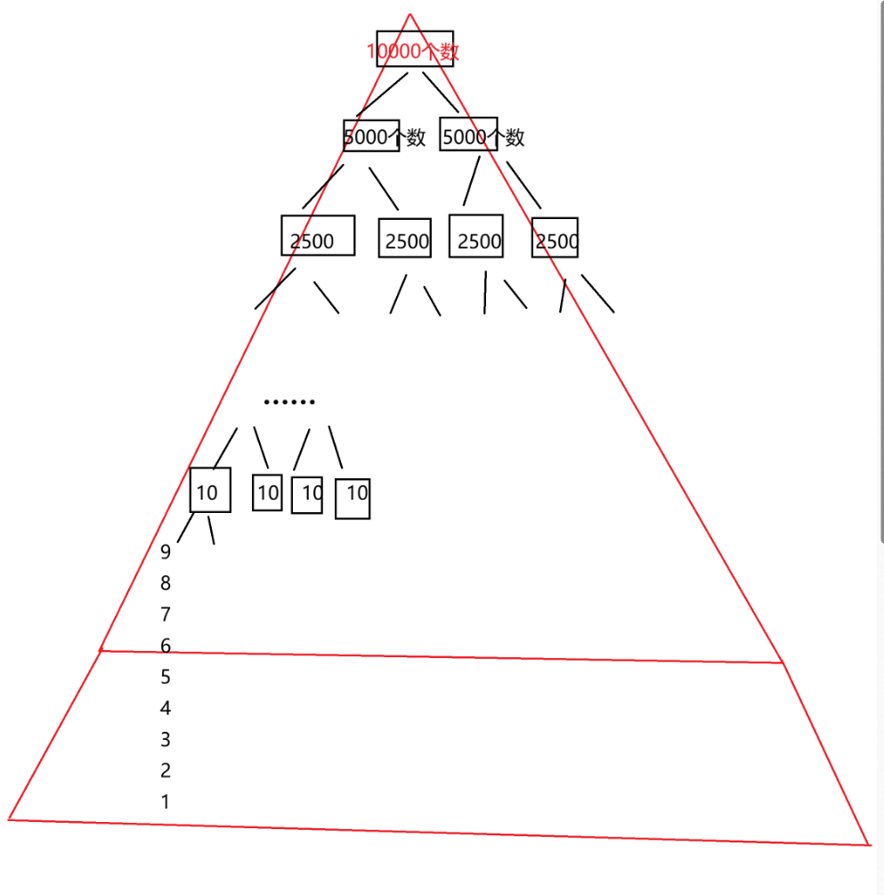 所谓小区间优化就是在区间的长度小于某个值的时候(比如10)改用插入排序,避免递归造成的开销。我们简单画个图就可以看出来这些小区间的递归还是占据了很大一部分空间。