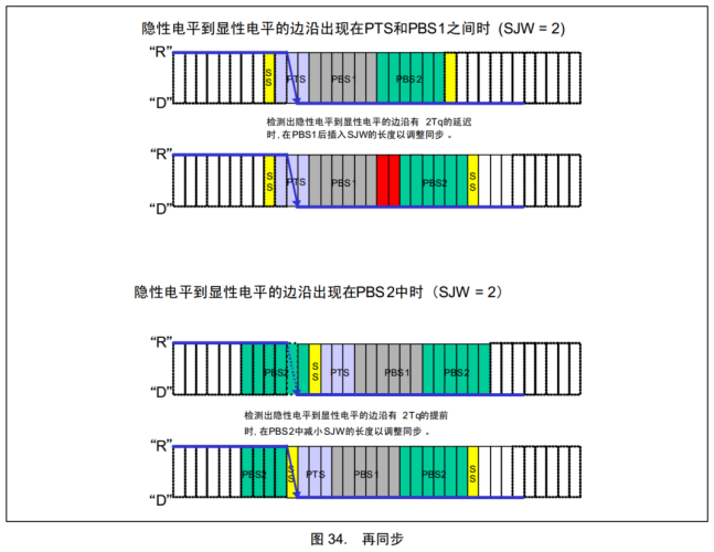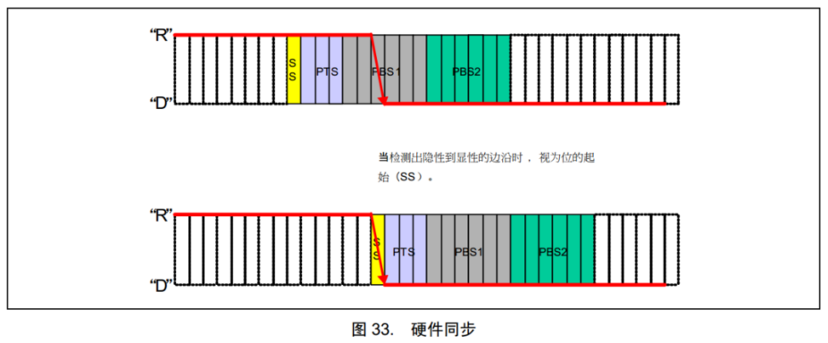如果,数据跳变边沿正好出现在SS段,那就说明当前设备与波形达成同步,如果数据跳变边沿不在SS段,那就要调整当前设备的位时序,使跳变边沿正好出现在同步段,使用硬同步和再同步调整
