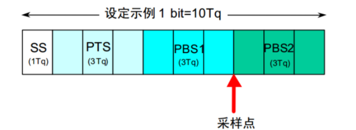 为了灵活调整每个采样点的位置,使采样点对齐数据位中心附近,CAN总线对每一个数据位的时长进行了更细的划分,分为同步段(SS)、传播时间段(PTS)、相位缓冲段1(PBS1)和相位缓冲段2(PBS2),每个段又由若干个最小时间单位(Tq)构成