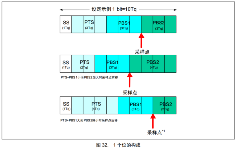 波特率 = 1 / 一个数据位的时长 = 1 / (TSS + TPTS + TPBS1 + TPBS2)