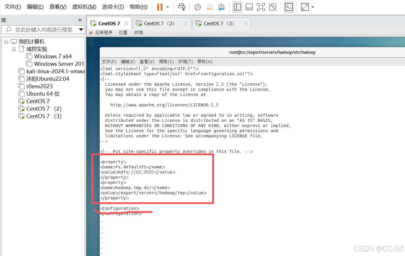 <property> <name>fs.defaultFS</name> <value>hdfs://CC:9000</value> </property> <property> <name>hadoop.tmp.dir</name> <value>/export/servers/hadoop/tmp</value> </property>