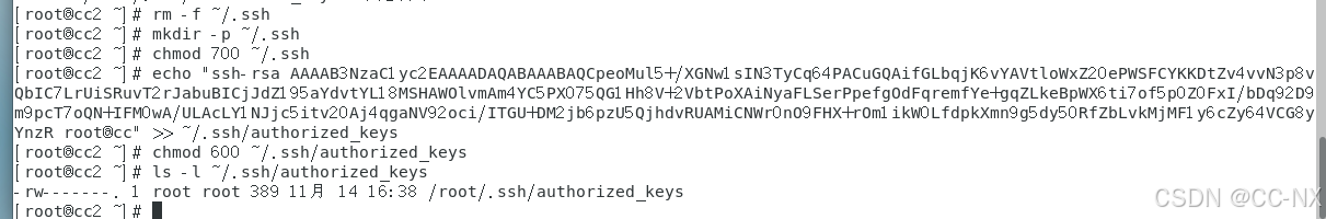 scp /root/.ssh/authorized_keys CC2:/root/.ssh