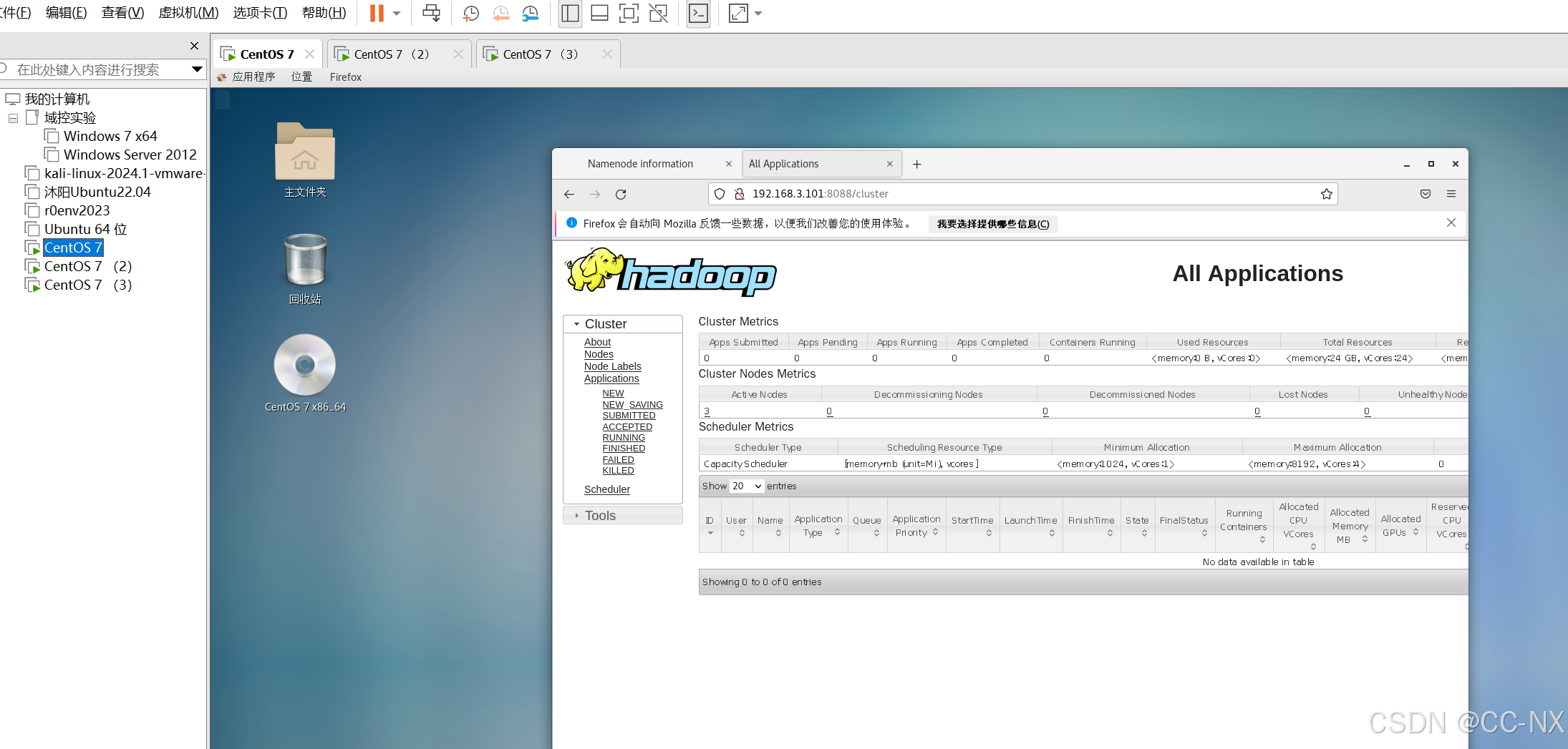 浏览器地址栏处输入(格式为:主机名或IP地址+端口号)可查看YARN集群管理页面
