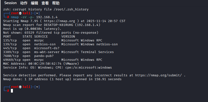 Nmap 扫描结果来看,目标主机(192.168.1.4)是一台 Windows 设备,开放了多个典型的 Windows 服务端口(135、139、445、3389 等)。这些端口对应的服务可能存在潜在漏洞,适合作为渗透学习的切入点。以下是针对这些端口的详细渗透思路和教程: