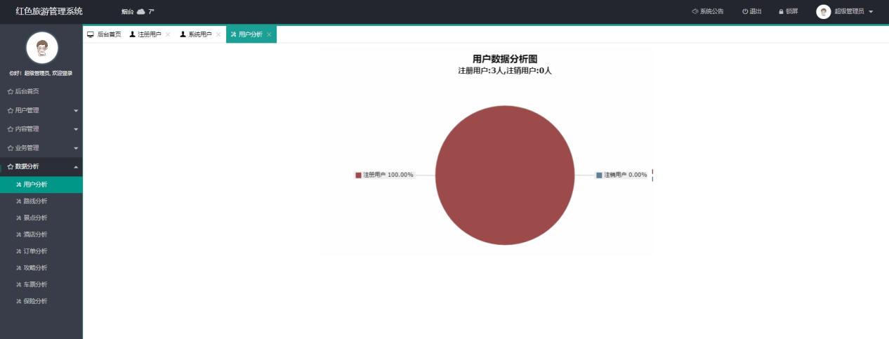 9.数据分析:该模块实现用户、景点、酒店、订单、攻略、车票、保险等各部分信息的图表分析,方便进一步管理系统。