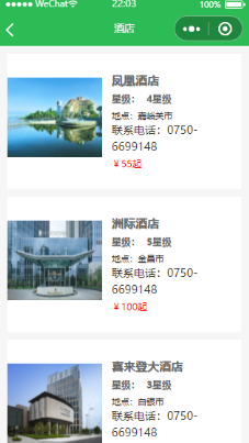 1.小程序首页:首页界面设计以简单、便捷、清晰为主。色彩搭配柔和,界面整体结构比较单调大方,系统用户将光标移动到对应模块并进行单击时候,都会跳转到相应的另一个网页。点击酒店信息时,界面下端会出现网站所有酒店信息供用户选择,包括酒店星级,编号,名称,电话,照片,操作等。点击旅游地图查询,可以查看各个地方旅游路线。