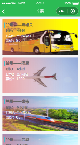 5.车票列表:这个模块向用户展示了各个路线的交通信息,供用户进行对比和选择,这里与其他不同的地方在于可以查询到多种交通工具的信息,并且通过一个始发站,查询得到的结果是与这个始发站匹配的所有数据库中存在的交通信息,方便用户得到更多更广的信息。