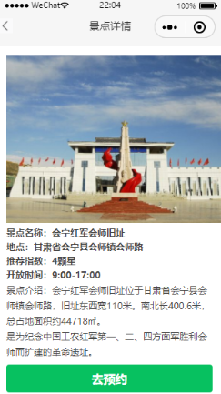 6.景点详情:在该模块部分中,用户可以在此对红色旅游景点进行查看。点击首页的旅游景点之后,用户可以看到该网站上所有红色旅游景点的具体详细信息,供用户快速便捷的搜索到自己想要的旅游景点信息。