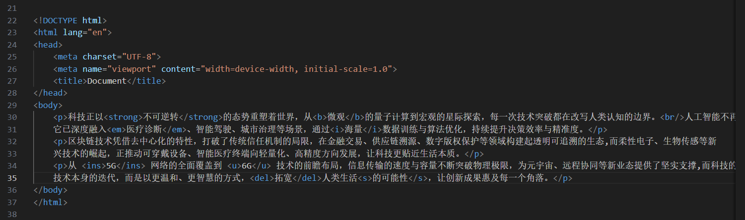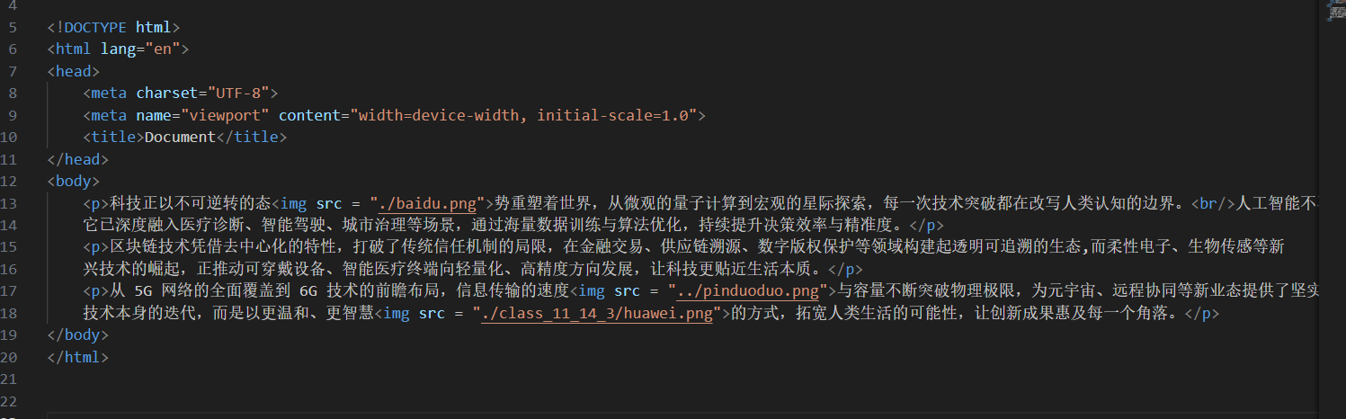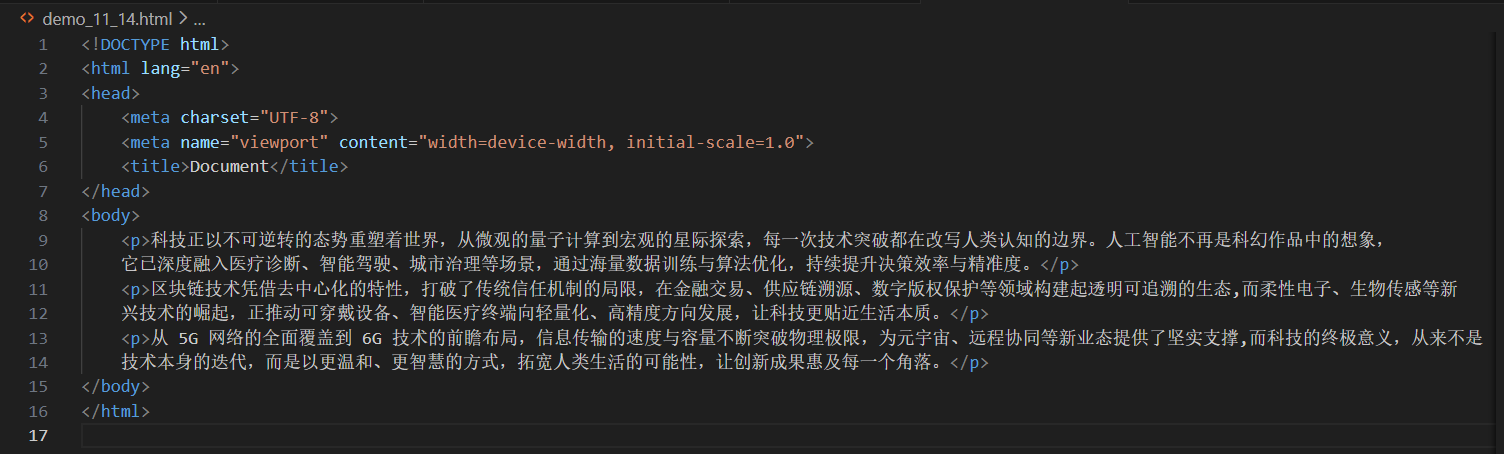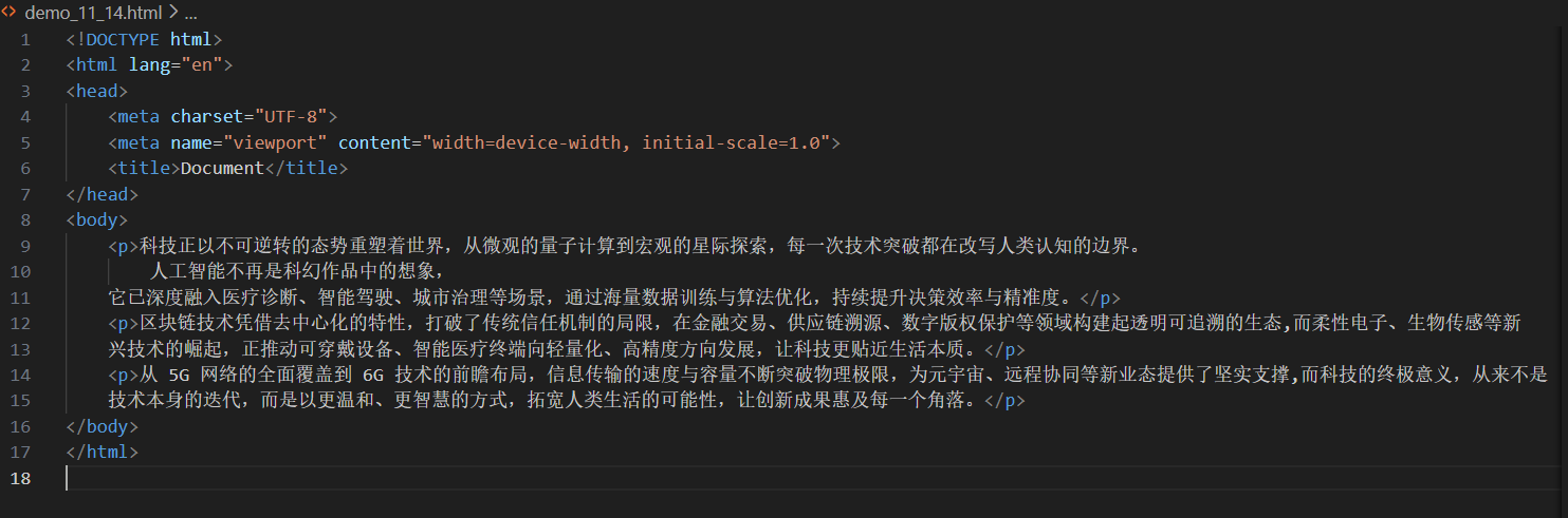 你会发现,写在一行了,并未分行写!说明在VScode里面的换行对浏览器没有用。那么这时就需要用到段落标签p标签,如图11所示: