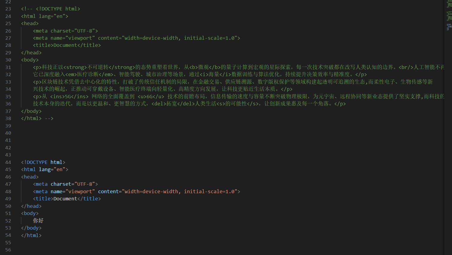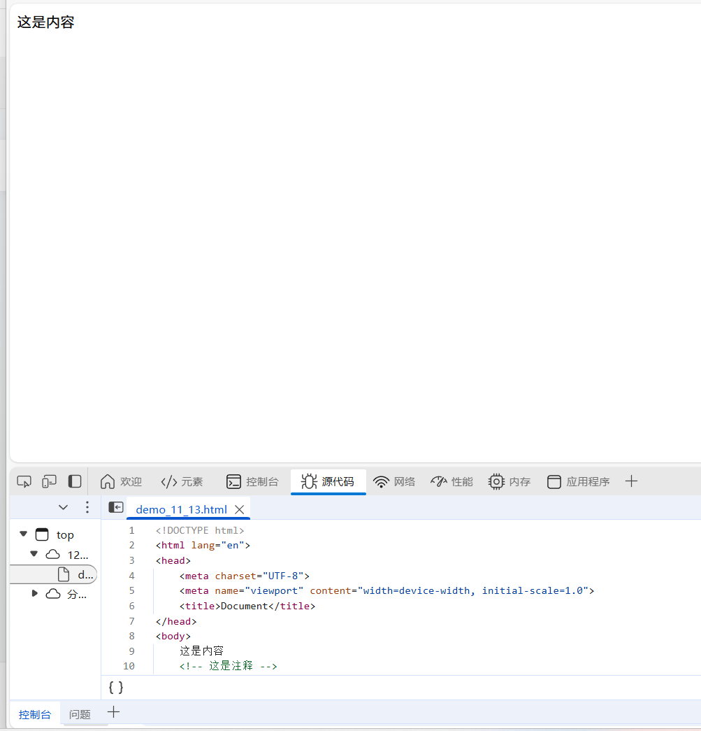 10.1当我把上一个完整的html文档结构注释掉后,想再复用html的基本框架结构,将原本body部分的内容替换成"你好",却发现浏览器里未能呈现"你好"这个结果!(如图13)