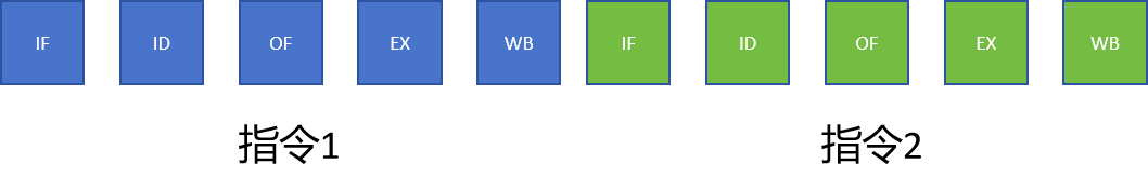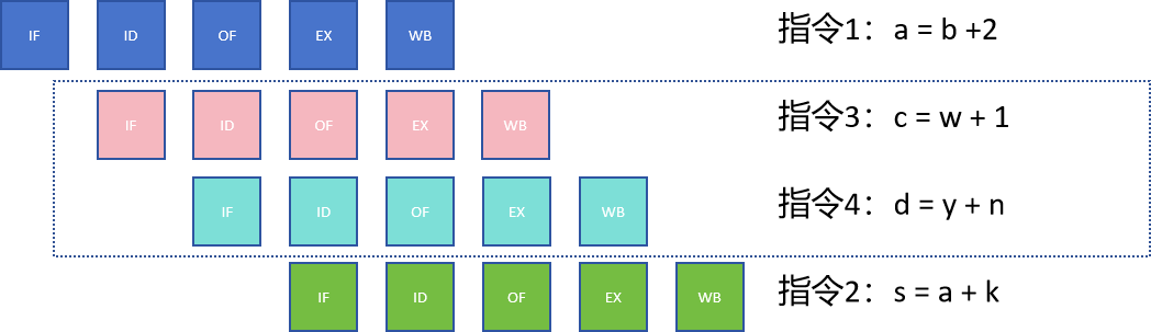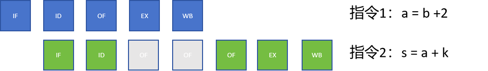 两个指令存在数据依赖关系,指令2在执行OF前需要等待a的结果写回,所以有两个cycle的等待时间