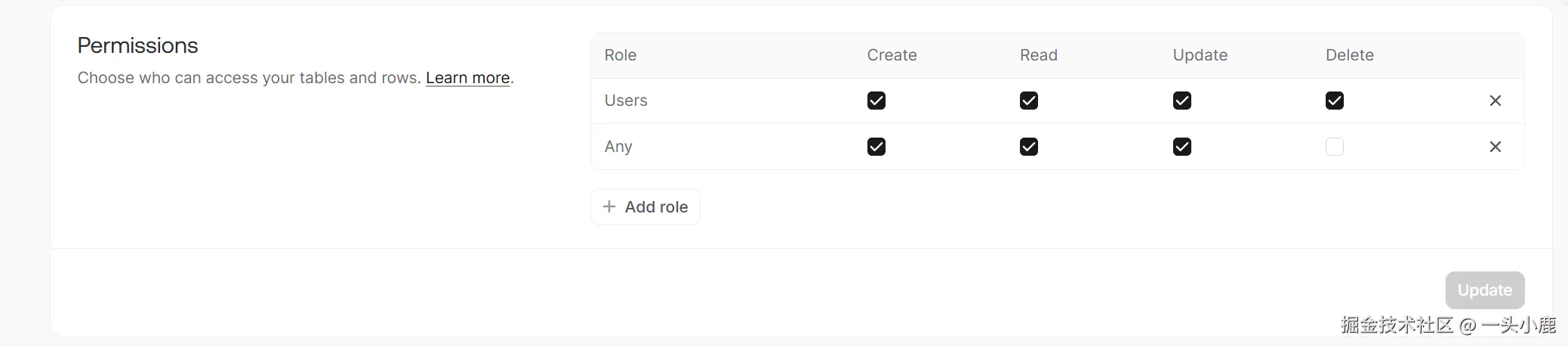 权限模型直接可视化,对于数据中的每个表的权限,创建、读、改都可以直接GUI调整。Appwrite用UI把权限(owner / user / role / team / public)做成了可视化界面。