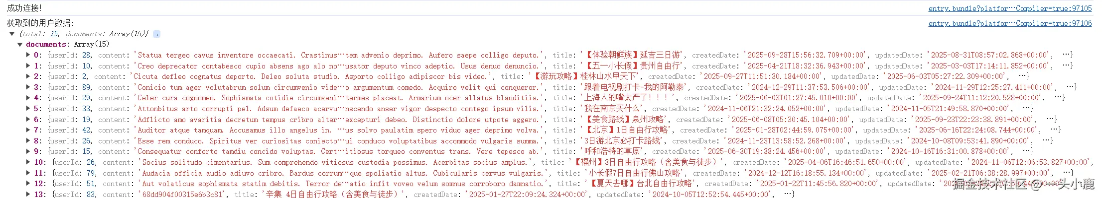 listDocuments 这个方法返回的结构里通常包含 total(符合条件的总条数)和 documents(当前页数组)。如果数据量很大,想要做无限滚动的页面,需要使用分页机制,可以参考我的另一篇文章。 【React Native+Appwrite】获取数据时的分页机制