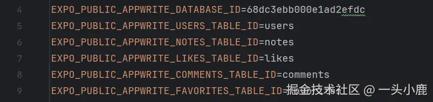 - 在.env文件中添加你的Appwrite相关ID(项目ID、数据库ID、表ID......),这是连接客户端的钥匙