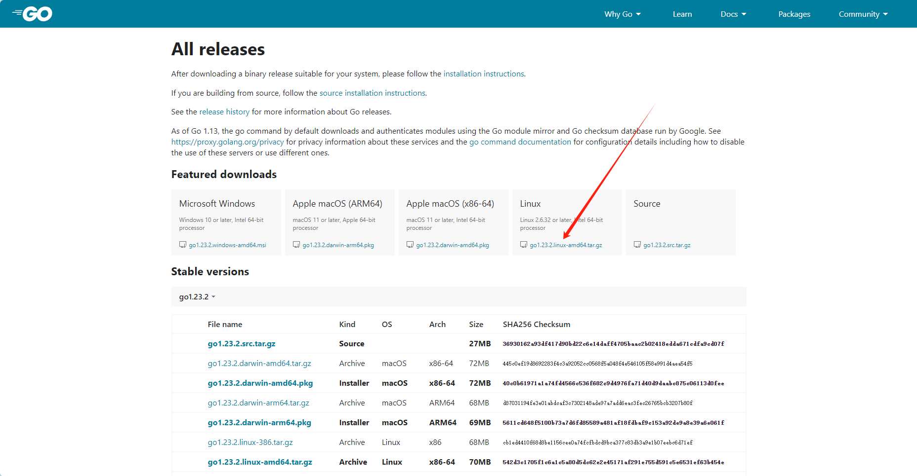 wget命令下载:wget https://dl.google.com/go/go1.23.2.linux-amd64.tar.gz -