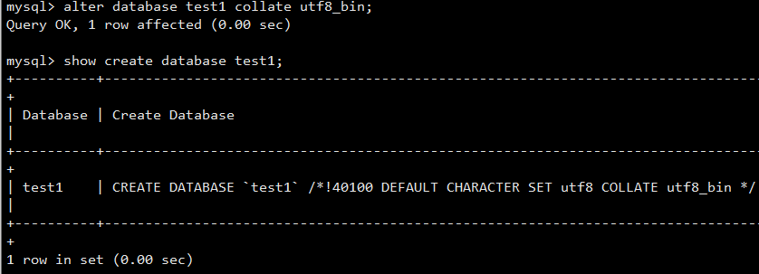 修改数据库:修改数据库可以使用alter database db_name,数据库一般需要修改的时数据库的字符集以及校验规则。这里将原本校验规则是utf8_general_ci的test1数据库改为了utf8_bin的校验规则。