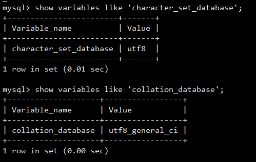 当我们没有指定字符集和校验规则时系统会使用默认字符集utf8,校验规则:utf8_general_ci,我们可以在系统中查看,查看默认字符集show variables like 'character_set_database';查看默认校验规则:show variables like 'collation_database';