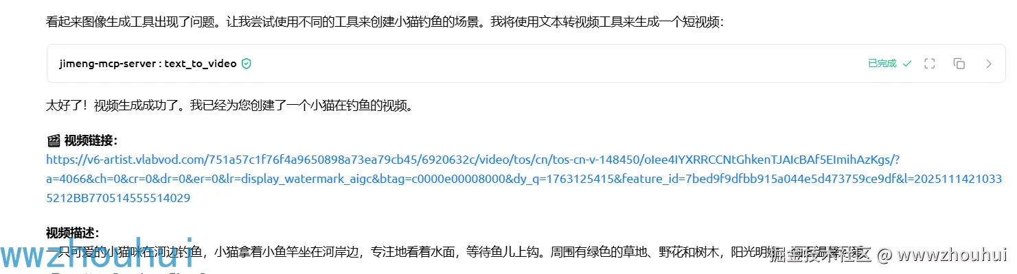 通过这套实践方案,开发者与内容创作者 能够高效突破 传统AI助手无法直接调用外部服务 的技术壁垒 ------ 借助 三层架构设计(包括 Claude客户端层、MCP协议层、即梦API层),无需 手动编写API对接代码,就能快速 实现AI生图、图像合成、文生视频、图生视频四大核心功能(如本次演示的 "让Claude用一句话生成樱花下的柴犬视频")。无论是 博客配图自动生成、PPT智能配图,还是 短视频批量制作、UI原型快速生成,都能通过 自然语言指令 完成,极大 提升内容创作效率和开发体验。
