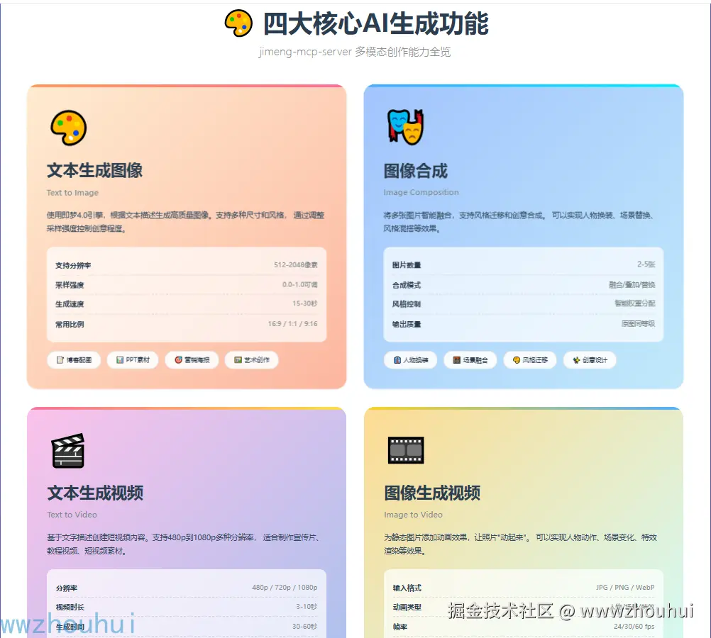 jimeng-mcp-server 是一个开源的MCP服务器实现,它将即梦AI的多模态生成能力封装成标准的MCP工具,让任何支持MCP协议的AI应用都能轻松调用。