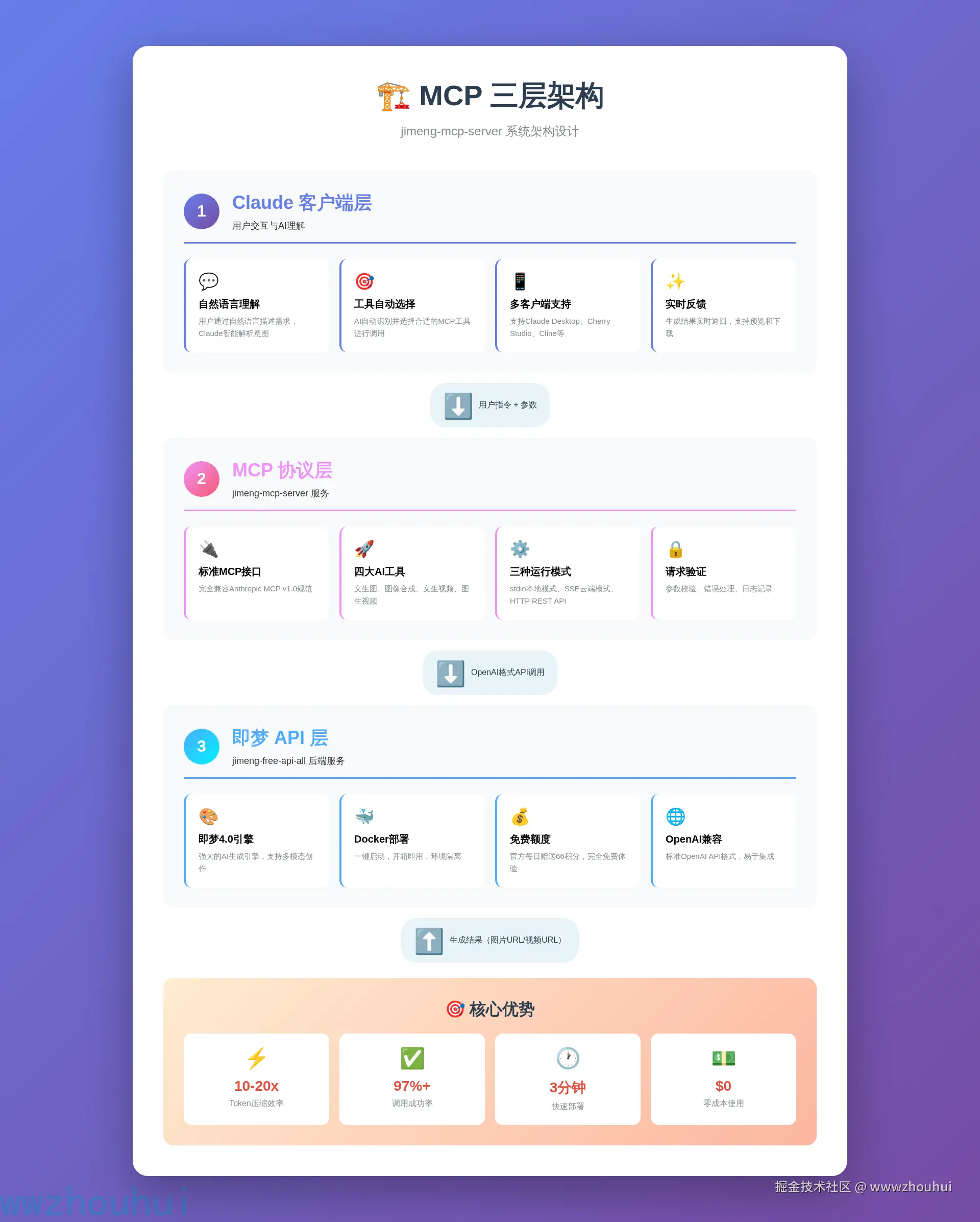 MCP(Model Context Protocol,模型上下文协议)是由Anthropic公司于2024年11月开源的标准化协议,专门用于解决AI模型与外部资源之间的连接问题。而今天要介绍的jimeng-mcp-server正是基于这个协议打造的即梦AI集成服务器,它能让Claude、Cherry Studio等AI应用直接调用即梦的"文生图"、"图像合成"、"文生视频"、"图生视频"四大核心能力。通过"Claude客户端 → MCP服务器 → 即梦API"的三层架构,实现了10-20倍的token压缩效率,同时保持97%以上的调用成功率。