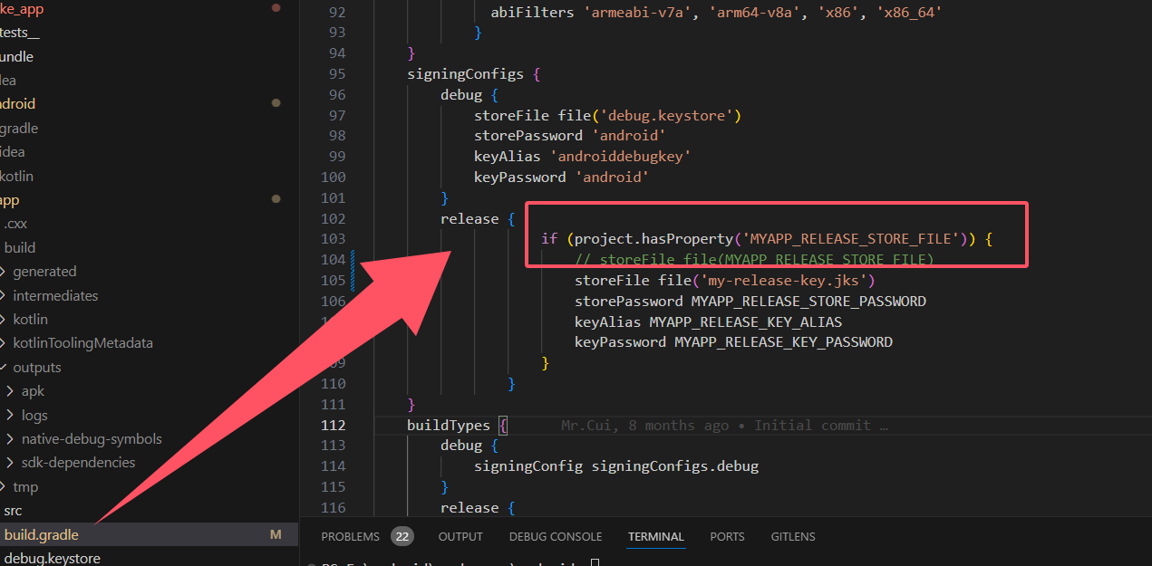 > Configure project :react-native-reanimated Android gradle plugin: 8.8.0 Gradle: 8.12 > Task :app:validateSigningRelease FAILED [Incubating] Problems report is available at: file:///E:/android/senke_app/android/build/reports/problems/problems-report.html FAILURE: Build failed with an exception. * What went wrong: Execution failed for task ':app:validateSigningRelease'. > Keystore file 'E:\android\senke_app\android\app\my-release-key.keystore' not found for signing config 'release'. * Try: > Run with --stacktrace option to get the stack trace. > Run with --info or --debug option to get more log output. > Run with --scan to get full insights. > Get more help at https://help.gradle.org. Deprecated Gradle features were used in this build, making it incompatible with Gradle 9.0. You can use '--warning-mode all' to show the individual deprecation warnings and determine if they come from your own scripts or plugins. For more on this, please refer to https://docs.gradle.org/8.12/userguide/command_line_interface.html#sec:command_line_warnings in the Gradle documentation. BUILD FAILED in 31s 882 actionable tasks: 46 executed, 836 up-to-date