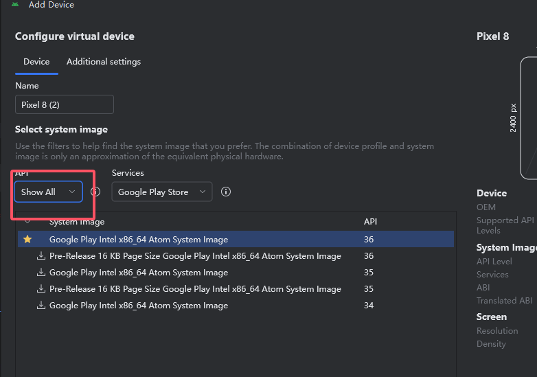 原因: 模拟器不对 sdk35 模拟器也得有。具体实现:这里的API选择 show All