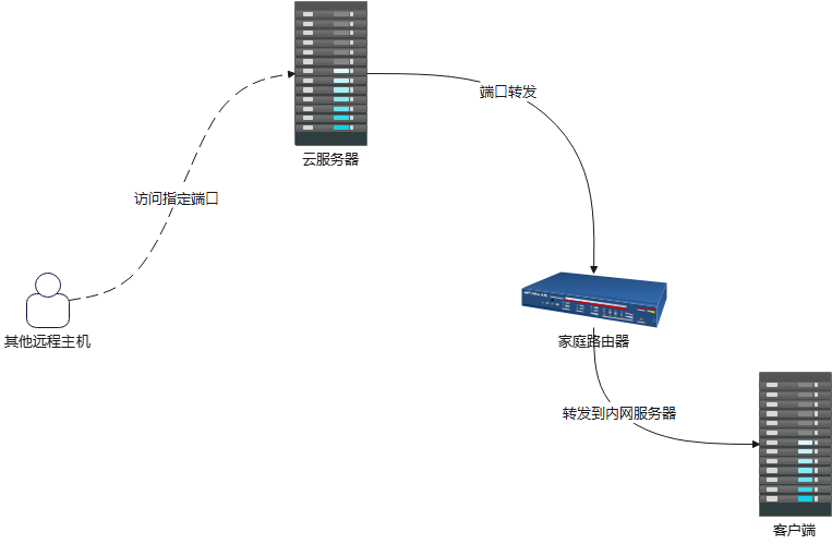 在准备搭建的内网穿透环境中,其他远程主机就是在外地的用户,客户端就是内网的服务器,云服务器作为 server 只是做一个转发功能,所以这里的