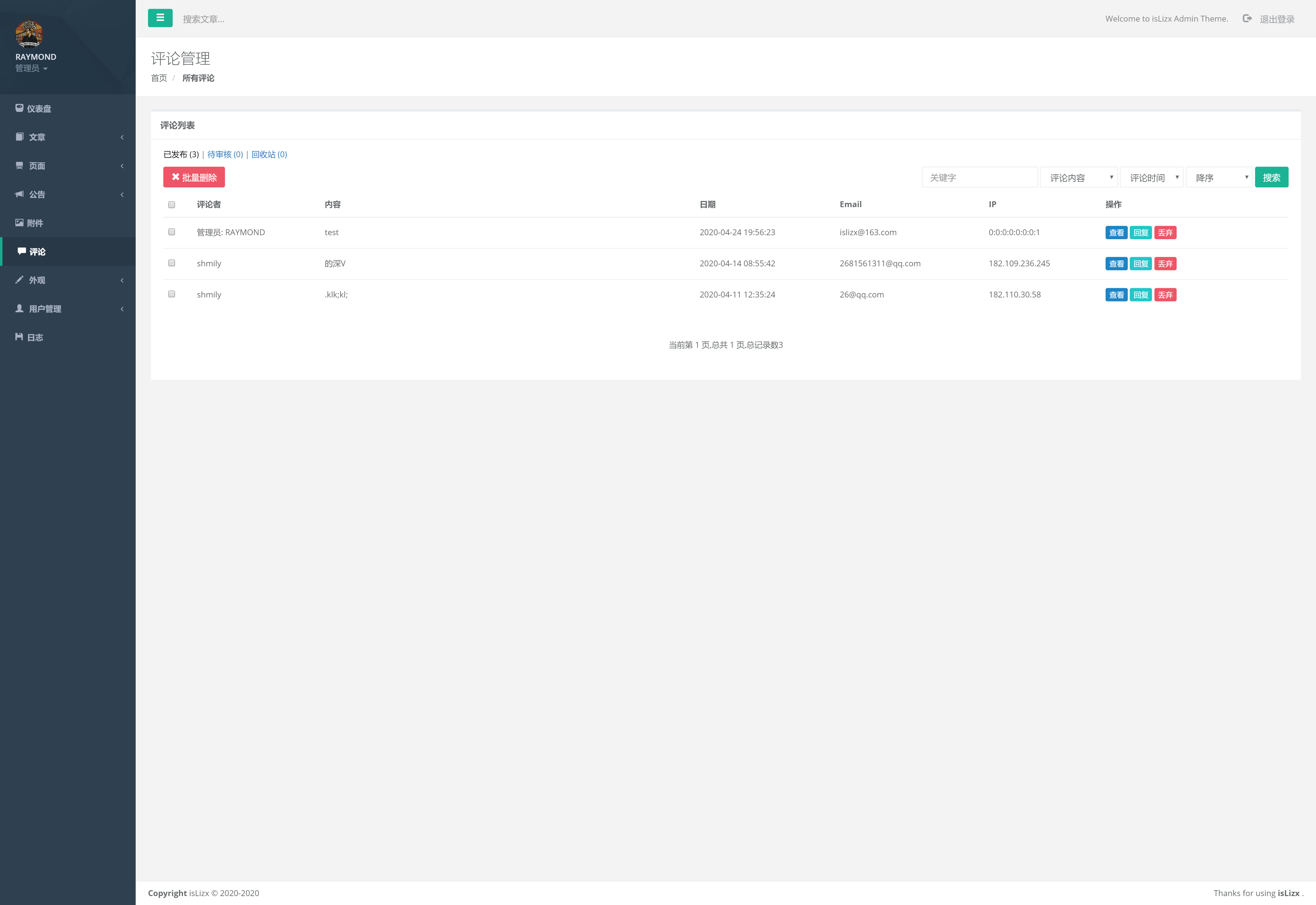 评论管理(管理员回复回收站和待审核的评论后直接通过审核并发送邮件给评论者)