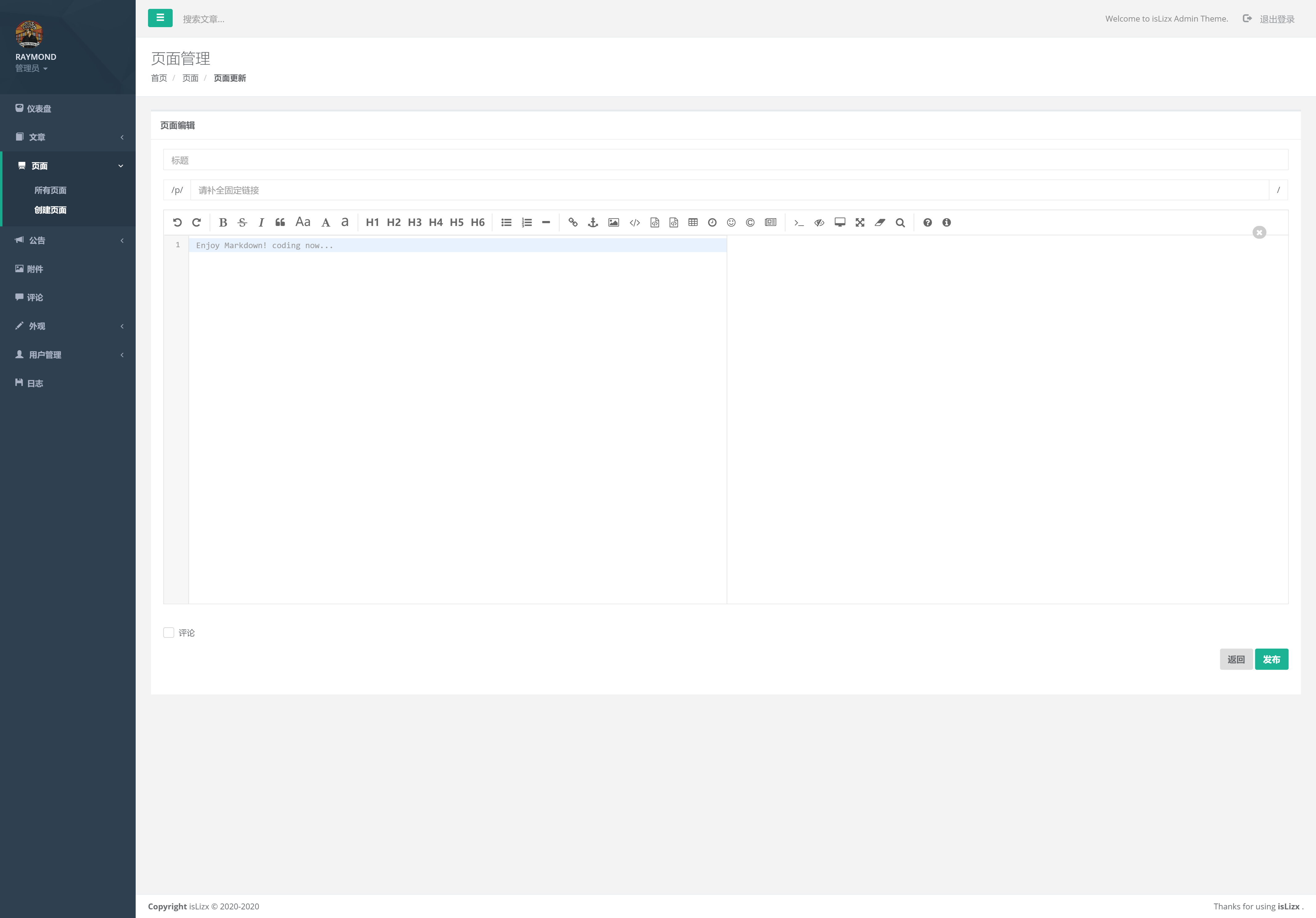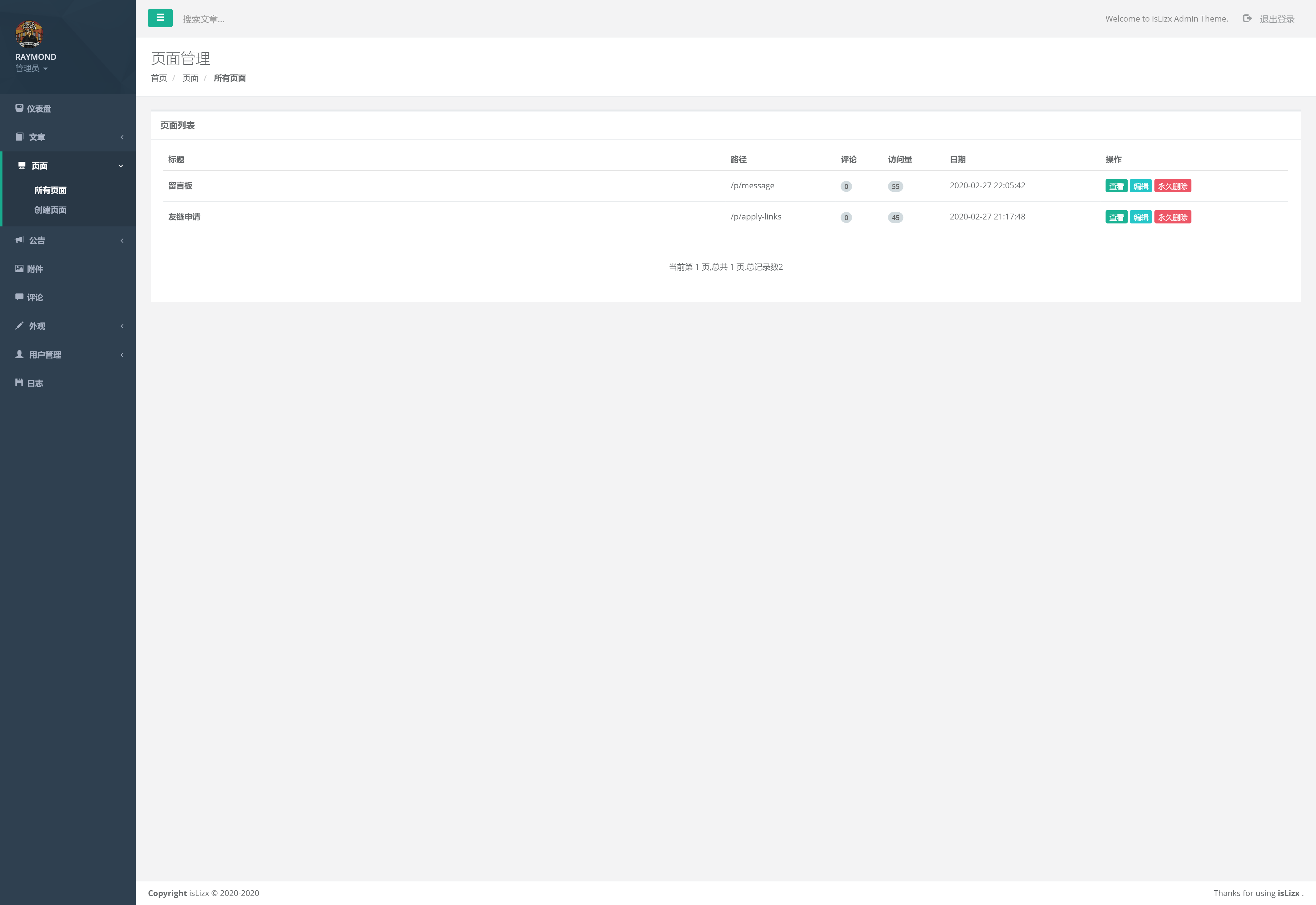 页面管理(可以自定义页面,申请友链和留言板即为自定义页面)