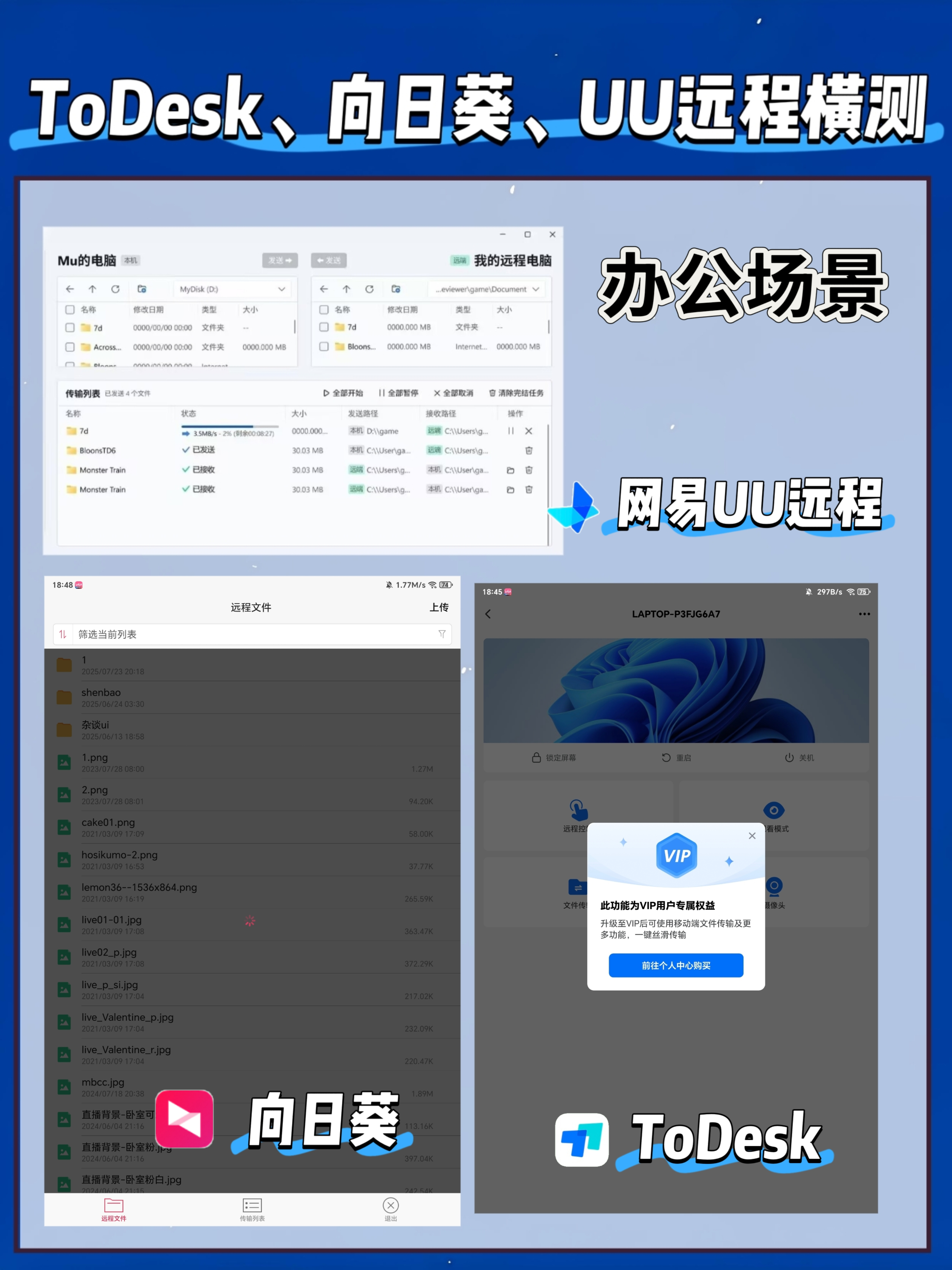 下面咱们拿ToDesk、向日葵、UU远程三款软件的功能全面性对比下