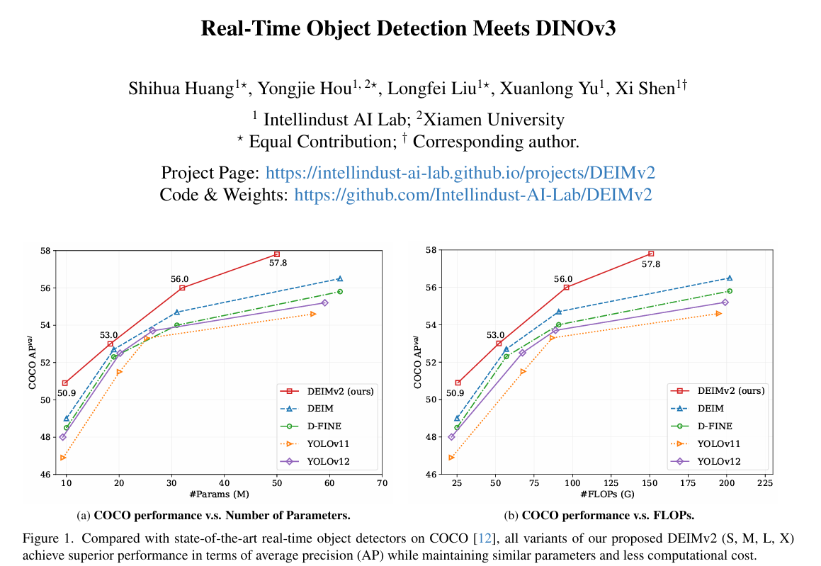 这篇题为《Real-Time Object Detection Meets DINOv3》的论文提出了DEIMv2------一个新一代实时目标检测框架,通过巧妙融合DINOv3的强语义表征能力与轻量级设计,在多个维度实现了突破。以下是核心总结: