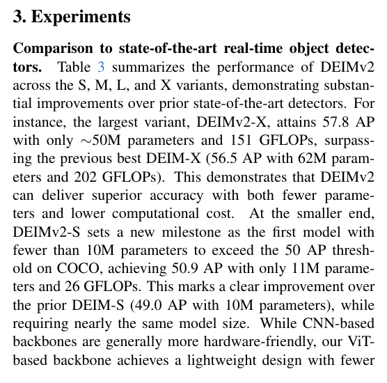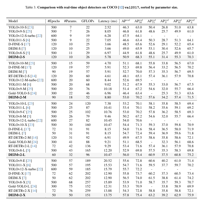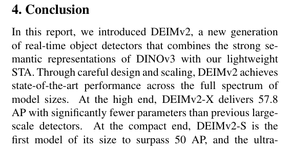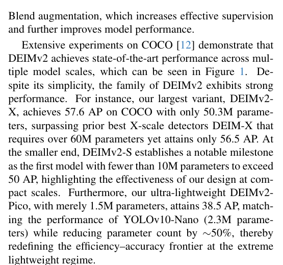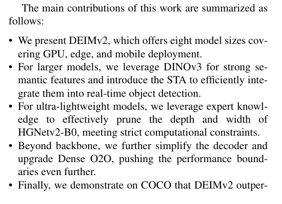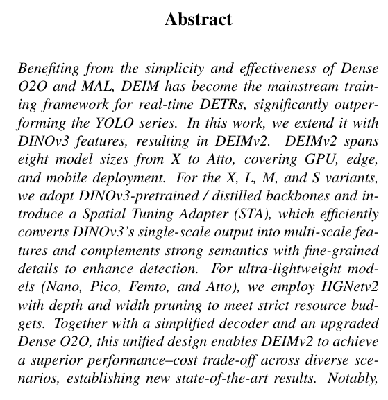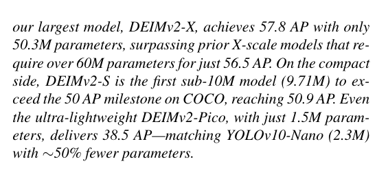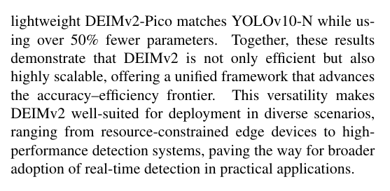 本报告介绍了新一代实时目标检测器DEIMv2,该系统通过将DINOv3的强语义表征能力与我们研发的轻量级STA模块相结合,实现了突破性进展。经过精心设计与规模扩展,DEIMv2在全系列模型尺寸上均达到了最先进的性能水*:在高端规格方面,DEIMv2-X以显著少于以往大型检测器的参数量实现了57.8 AP的卓越精度;在紧凑型领域,DEIMv2-S成为同尺寸模型中首个突破50 AP大关的标杆;而超轻量级DEIMv2-Pico在参数量减少超50%的前提下仍保持与YOLOv10-N相当的检测能力。这些成果共同证明DEIMv2不仅具备卓越效率,更拥有高度可扩展性,提供了一个能持续推升"精度-效率"边界的统一框架。这种多场景适应性使DEIMv2非常适合从资源受限的边缘设备到高性能检测系统的多样化部署环境,为实时检测技术在实际应用中的广泛普及开辟了新的道路。