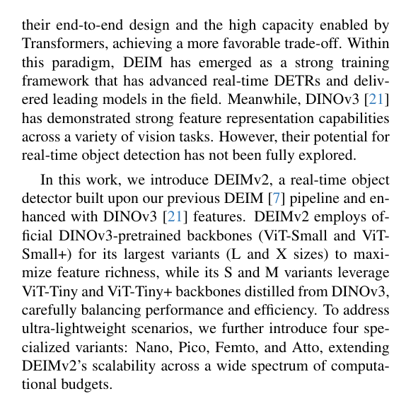 本工作中,我们推出了DEIMv2------一个基于我们先前DEIM[7] pipeline构建,并通过DINOv3[21]特征增强的实时目标检测器。DEIMv2在其最大变体(L和X尺寸)中采用官方DINOv3预训练主干网络(ViT-Small和ViT-Small+)以最大化特征丰富度,而其S和M变体则利用从DINOv3蒸馏得到的ViT-Tiny和ViT-Tiny+主干网络,精心*衡性能与效率。为应对超轻量级场景,我们进一步引入了四个专门变体:Nano、Pico、Femto和Atto,从而将DEIMv2的可扩展性延伸至广泛的计算预算范围。