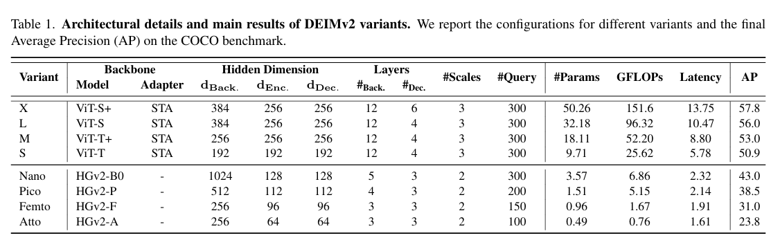 我们提出了DEIMv2系列模型,提供涵盖GPU、边缘计算和移动端部署的八种不同规模版本。