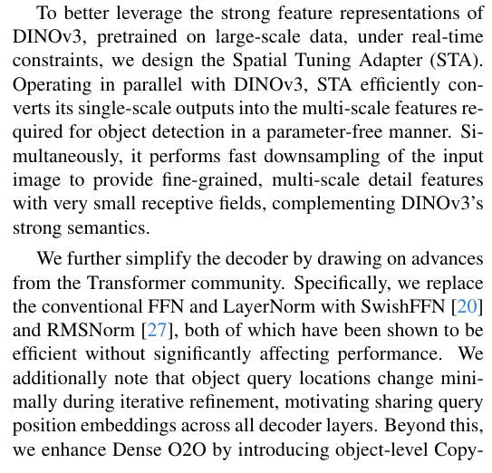 针对较大规模模型,我们利用DINOv3获取强语义特征,并引入空间调谐适配器(STA)将其高效集成到实时目标检测流程中。