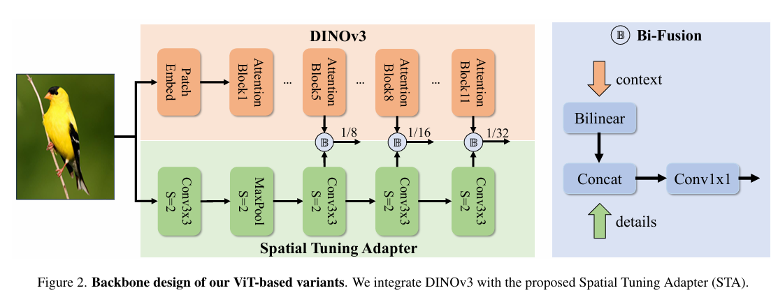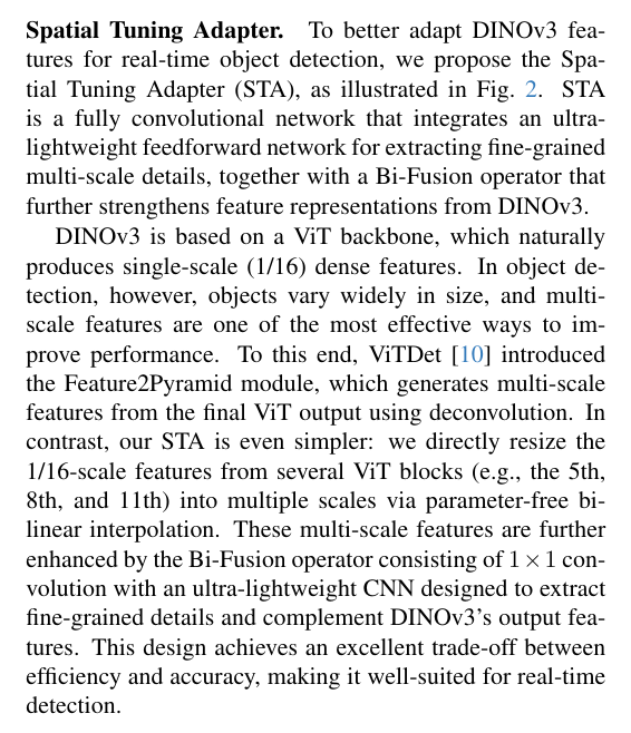 空间调谐适配器 为更好地使DINOv3特征适配实时目标检测任务,我们提出了如图2所示的空间调谐适配器(STA)。该模块是一个全卷积网络,集成了一個用于提取细粒度多尺度细节的超轻量前馈网络,以及一个能进一步增强DINOv3特征表征能力的双向融合算子。