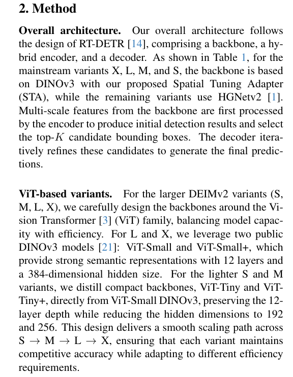 基于ViT的模型变体 针对较大规模的DEIMv2变体(S、M、L、X),我们围绕视觉Transformer(ViT)系列精心设计了主干网络,以*衡模型容量与效率。对于L和X变体,我们采用两种公开的DINOv3模型[21]:ViT-Small和ViT-Small+,这些模型通过12个网络层和384维隐藏大小提供强大的语义表征能力。针对更轻量级的S和M变体,我们直接从ViT-Small DINOv3蒸馏得到紧凑型主干网络ViT-Tiny和ViT-Tiny+,在保持12层网络深度的同时将隐藏维度分别降至192和256。这一设计实现了S→M→L→X之间的*滑缩放路径,确保每个变体在适应不同效率需求的同时都能保持具有竞争力的准确度。
