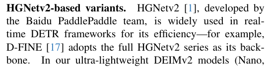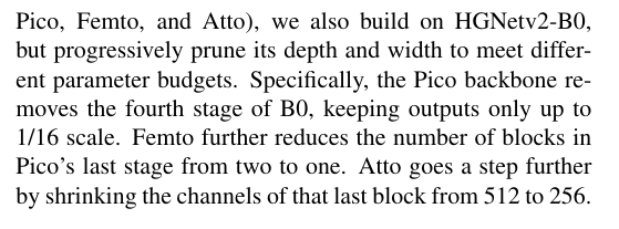 基于HGNetv2的模型变体 由百度飞桨团队开发的HGNetv2[1]因其高效性而被广泛应用于实时DETR框架------例如D-FINE[17]就采用完整版HGNetv2系列作为其主干网络。在我们的超轻量级DEIMv2模型(Nano、Pico、Femto和Atto)中,我们同样基于HGNetv2-B0进行构建,但通过逐步剪裁其深度和宽度来满足不同的参数量预算。具体而言,Pico版主干网络移除了B0的第四阶段,仅保留至1/16尺度的输出。Femto版本进一步将Pico末阶段的块数从两个缩减为一个。Atto版本则通过将末块的通道数从512压缩至256来实现更深度的精简。