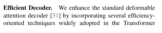 我们借鉴Transformer领域的最新进展进一步简化了解码器。具体而言,我们将传统的FFN和LayerNorm替换为SwishFFN[20]和RMSNorm[27]------这两种组件均被证明能在不影响性能的前提下提升效率。我们还发现物体查询位置在迭代优化过程中变化极小,这促使我们在所有解码层之间共享查询位置嵌入。除此之外,我们通过引入物体级复制-混合数据增强来增强Dense O2O,此举增加了有效监督并进一步提升了模型性能。