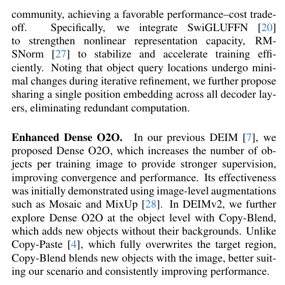 增强型Dense O2O 在我们先前提出的DEIM[7]中,我们引入了Dense O2O方法,通过增加每张训练图像中的物体数量来提供更强的监督信号,从而改善收敛性与性能。该方法最初通过Mosaic和MixUp[28]等图像级增强技术验证了其有效性。在DEIMv2中,我们进一步在物体层面探索Dense O2O的潜力,提出了Copy-Blend增强策略------该策略仅添加新的物体实例而不包含其背景信息。与完全覆盖目标区域的Copy-Paste[4]技术不同,Copy-Blend将新物体与原始图像进行融合处理,这种设计更契合我们的应用场景,并持续带来性能提升。