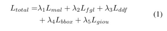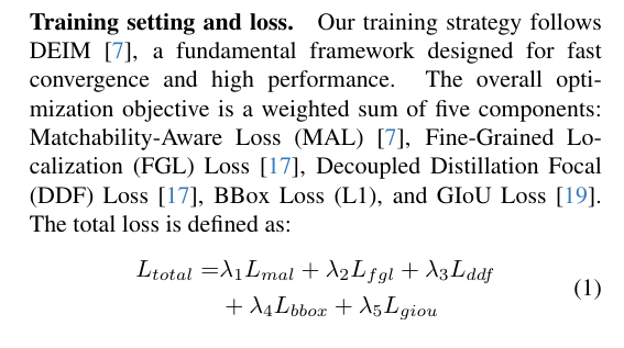 训练设置与损失函数 我们的训练策略遵循DEIM[7]这一专为快速收敛与高性能设计的基础框架。整体优化目标由五个损失分量的加权和构成:匹配感知损失(MAL)[7]、细粒度定位损失(FGL)[17]、解耦蒸馏焦点损失(DDF)[17]、边界框回归损失(L1)以及GIoU损失[19]。总损失函数定义为各分量的加权组合,所有实验中权重参数设定为λ1=1.0,λ2=0.15,λ3=1.5,λ4=5,λ5=2。