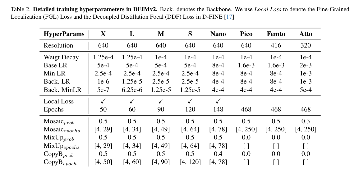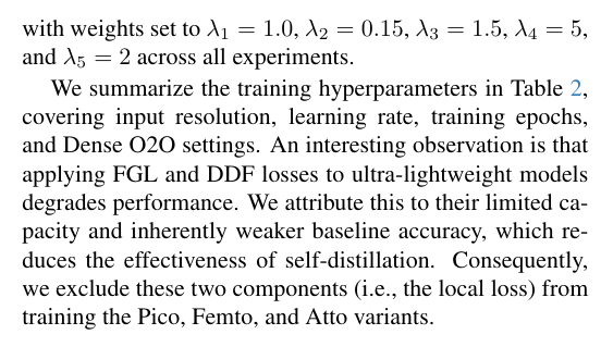 我们在表2中汇总了训练超参数,包括输入分辨率、学习率、训练周期和Dense O2O设置。一个有趣的发现是:对超轻量级模型应用FGL和DDF损失反而会导致性能下降。我们将此归因于其有限模型容量与固有较弱的基础精度,这降低了自蒸馏机制的有效性。因此,在训练Pico、Femto和Atto变体时,我们排除了这两个损失分量(即局部损失)。