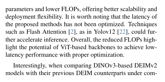 与最先进实时目标检测器的对比 表3汇总了DEIMv2在S、M、L、X四个变体上的性能表现,结果显示其相较先前最优检测器实现了显著提升。具体而言:最大规格的DEIMv2-X以仅约5000万参数和151G FLOPs的计算量取得了57.8 AP,超越了此前最佳的DEIM-X(该模型需要6200万参数和202G FLOPs却仅获得56.5 AP)。这证明DEIMv2能够以更少的参数和更低的计算成本实现更优的精度。在小型模型端,DEIMv2-S创造了新的里程碑------成为首个参数量不足1000万却在COCO数据集上突破50 AP阈值的模型,仅以1100万参数和26G FLOPs即达成50.9 AP。这较之前的DEIM-S(1000万参数实现49.0 AP)呈现明显进步,同时保持了*乎相同的模型规模。尽管基于CNN的主干网络通常更具硬件友好性,但我们基于ViT的主干以更少的参数和更低的FLOPs实现了轻量级设计,提供了更优的可扩展性与部署灵活性。需要特别说明的是,本方法的推理延迟尚未经过专门优化。若采用YOLOv12[22]中使用的FlashAttention[2]等技术,可进一步加速推理过程。总体而言,FLOPs的降低凸显了基于ViT的主干网络通过适当优化后实现低延迟性能的巨大潜力。