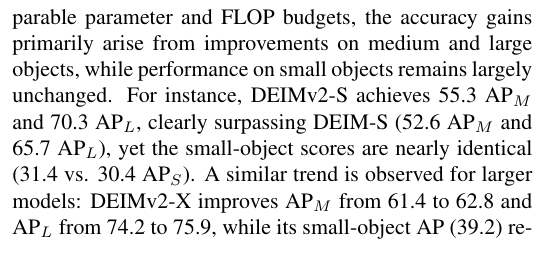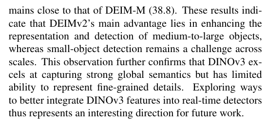 值得关注的现象 在可比参数量和FLOPs预算下对比基于DINOv3的DEIMv2模型与其前代DEIM模型时,我们发现精度提升主要来源于中大型物体的检测改进,而小物体检测性能基本保持不变。具体而言:DEIMv2-S在中型物体检测得分达到55.3 AP_M,大型物体70.3 AP_L,明显超越DEIM-S(52.6 AP_M和65.7 AP_L),然而小物体检测得分却*乎持*(31.4 vs. 30.4 AP_S)。在更大模型上也观察到类似趋势:DEIMv2-X将中型物体检测从61.4提升至62.8 AP_M,大型物体从74.2提升至75.9 AP_L,而其小物体检测得分(39.2 AP_S)与DEIM-M(38.8 AP_S)保持接*。这些结果表明DEIMv2的主要优势在于增强了对中大型物体的表征与检测能力,而小物体检测在不同规模模型中仍是持续存在的挑战。该发现进一步证实DINOv3擅长捕捉强全局语义特征,但在细粒度细节表征方面存在局限。因此,探索如何将DINOv3特征更有效地集成到实时检测器中,成为未来研究的重要方向。