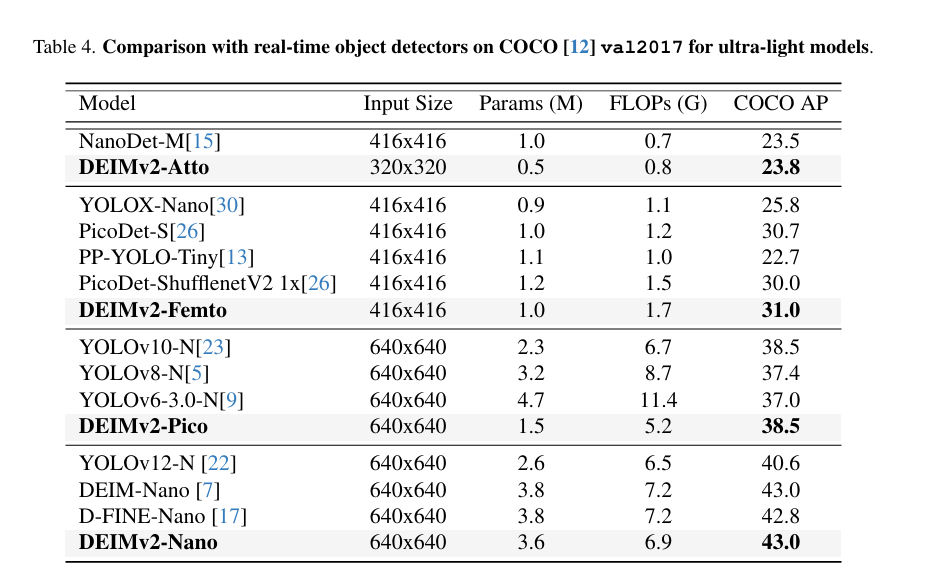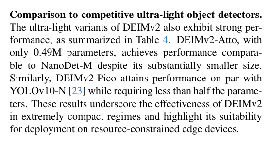 与竞争性超轻量目标检测器的对比 DEIMv2的超轻量级变体同样展现出强劲性能,其对比数据汇总于表4。仅含49万参数的DEIMv2-Atto在模型体积显著更小的前提下,实现了与NanoDet-M相当的性能表现。同样地,DEIMv2-Pico在达到YOLOv10-N[23]同等性能水*的同时,所需参数量不足后者的一半。这些成果印证了DEIMv2在极致紧凑模型领域的有效性,并凸显其适用于资源受限边缘设备部署的显著优势。