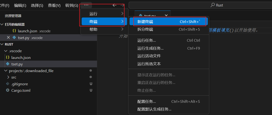 - 打开 VS Code,新建终端(点击顶部菜单栏「终端 → 新建终端」,或按 `Ctrl+``)。